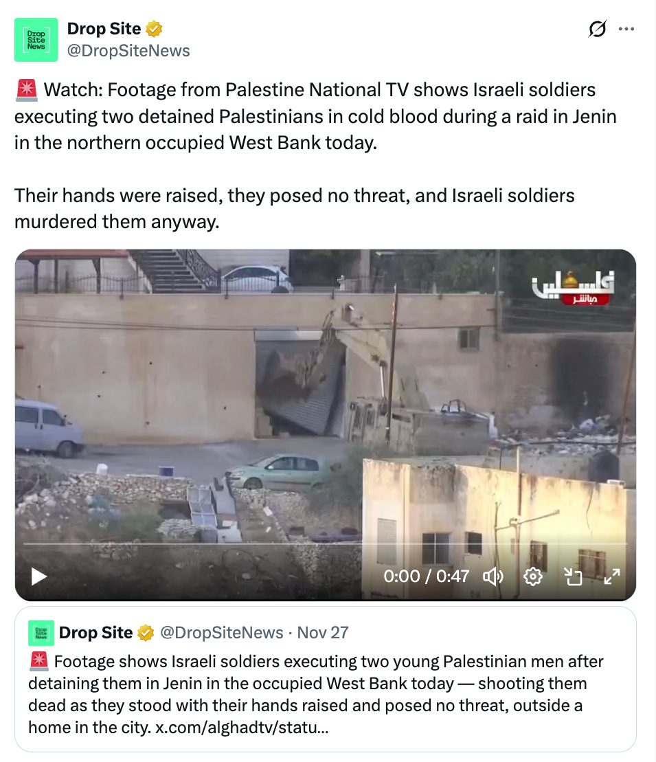 1 DECEMBER—Video documentation raced like wildfire through the West Bank last Thursday, showing Israel security forces shooting two unarmed Palestinians in the city of Jenin. Muntaser Billah Abdallah, 26, and Yousef Asaasah, 37 were shot at close range after having surrendered and while lying on their stomachs.