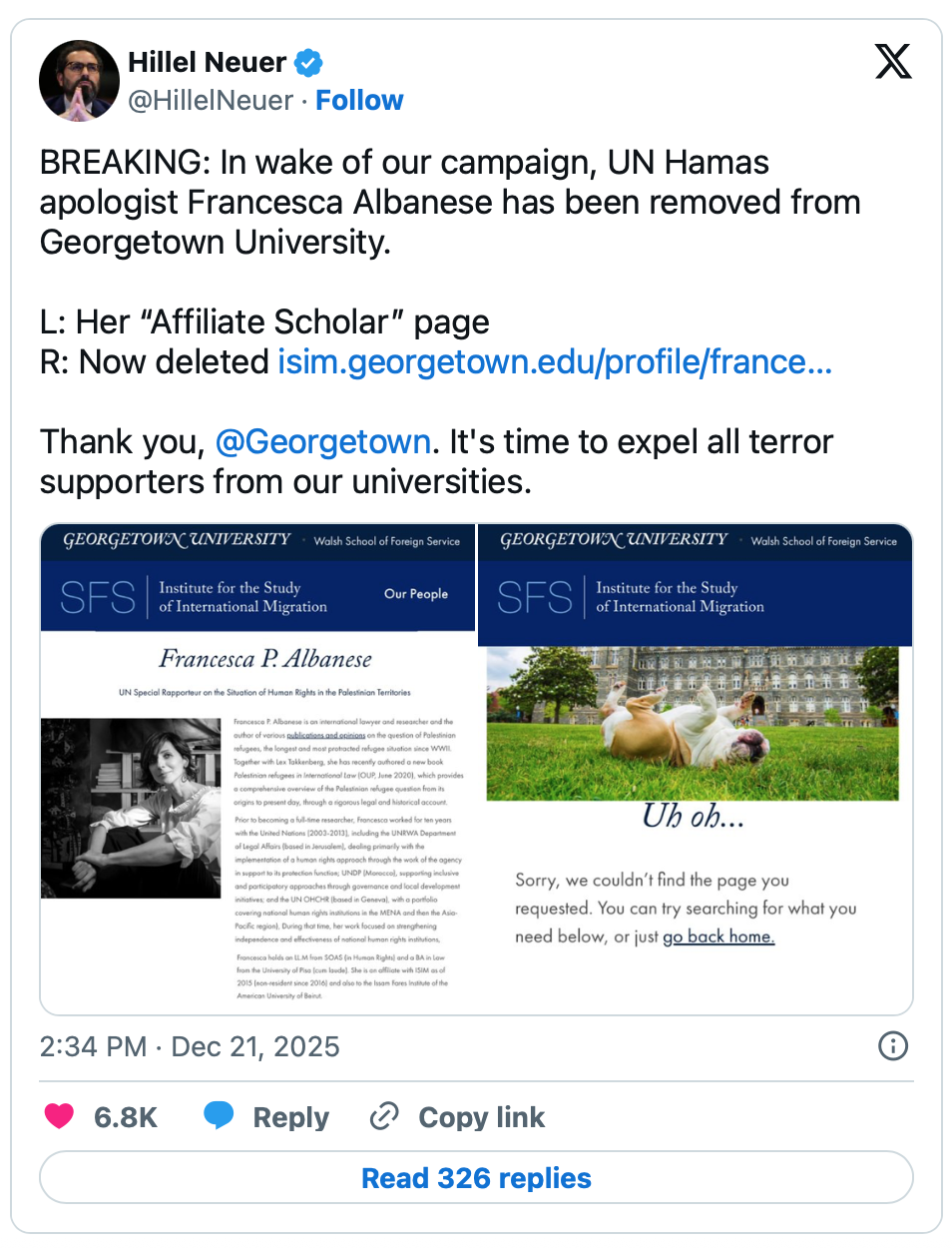 For over six months, UN Watch has been advocating for Georgetown University to remove Albanese from its faculty.