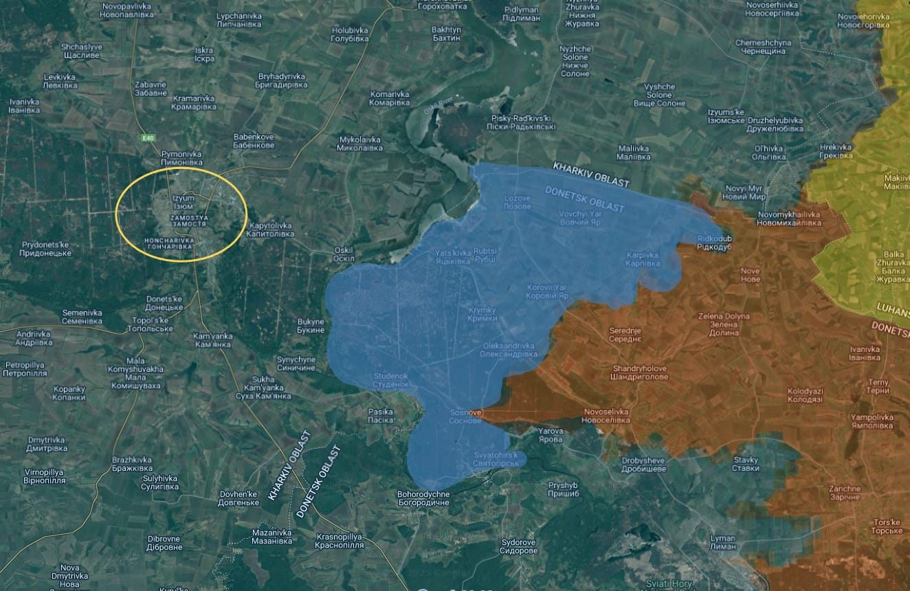 The blue shaded area below shows the natural limit of what Russians can capture on the way toward Izyum, before reaching the Oskol barrier: