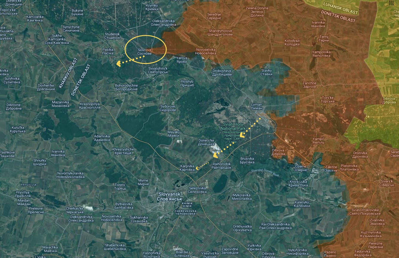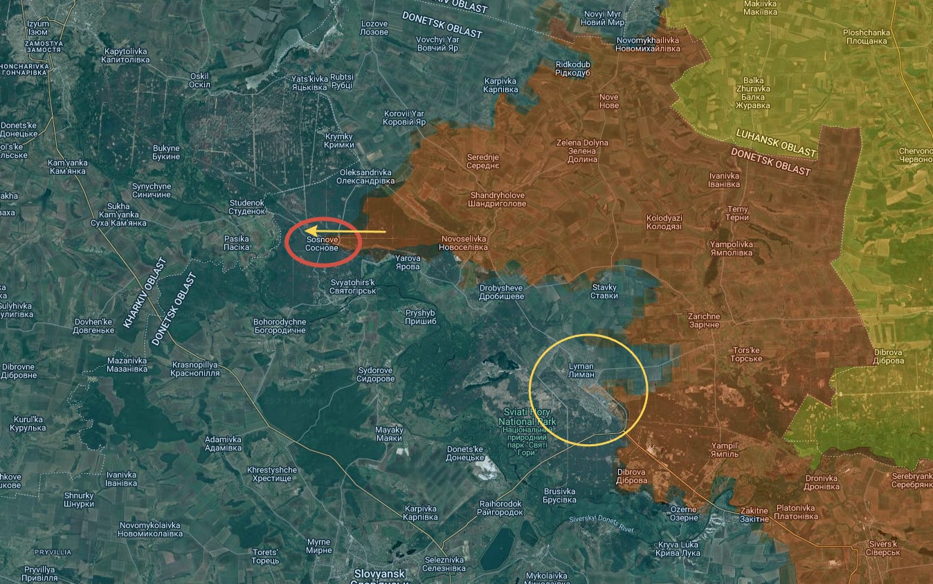 With the surprise advance to Sosnove, what we are seeing is the encirclement of Lyman, which appears set to be the next town to fall in the not-too-distant future.