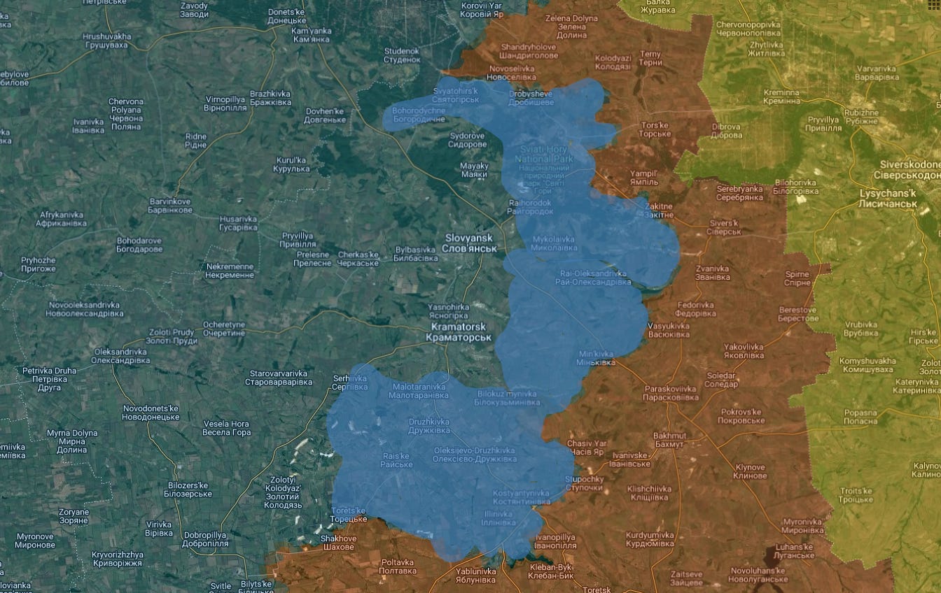 The more likely scenario would be Russian forces continuing up toward the Kramatorsk agglomerate from the Kontantinovka direction, given that large city captures have become much more Russia’s forte compared to the crossing of treacherous natural terrain like rivers, swamps, and forests.