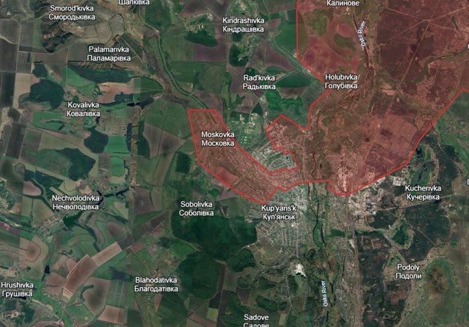 As for the nearby Kupyansk direction, there are signs of a turnaround there with Russian forces now having been geolocated in the below ‘Moskovka’ area, which would confirm that Ukraine has not retaken remotely as much territory as previously thought: