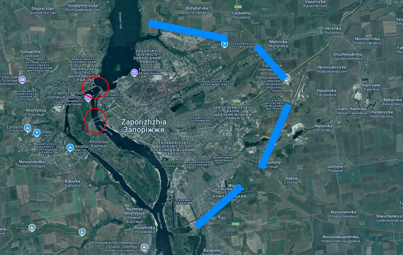 Once Russian troops (blue lines) have surrounded it and the bridges westward are under drone fire control (red circles), it’s pretty much game over and will likely culminate in another Azovstal-like “final holdout” and siege in some downtown industrial sector: