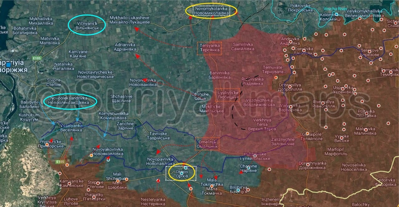 Let us start on this sector. I have already written at length about my prediction here specifically. As can be seen by the rate of advance above, Russia is capturing one defensive block between major rivers every two or three months. The next block will take them to the Orekhov-Novomykolaivka line (circled in yellow below), and should take another 2-3 months at most, and possibly faster.