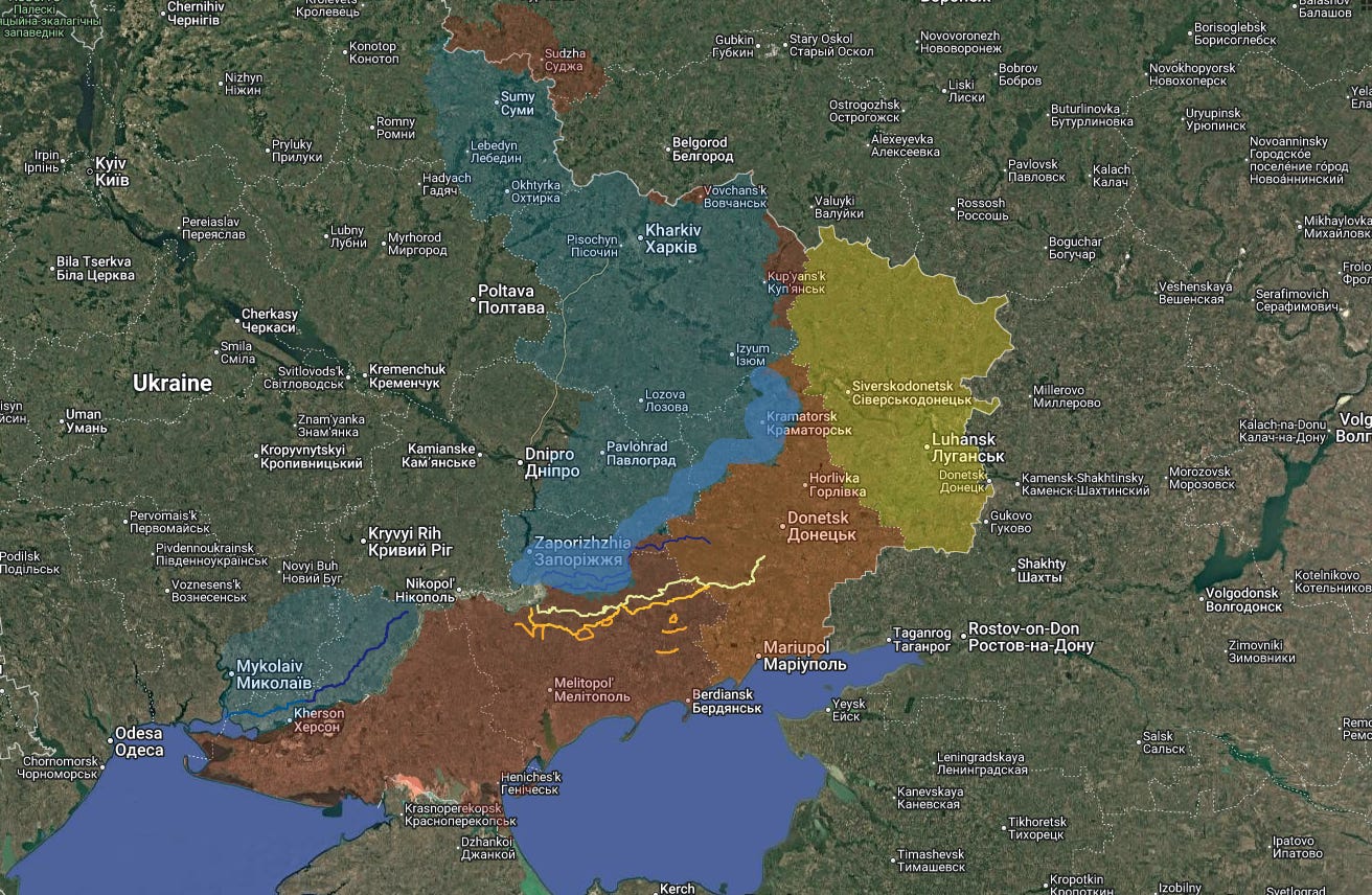 Suriyak had the same idea so I’ll use his map and analysis (follow along on his map here)—the area shaded in brighter red is the next area Russia will capture in the next couple months as it barrels toward Zaporozhye city:
