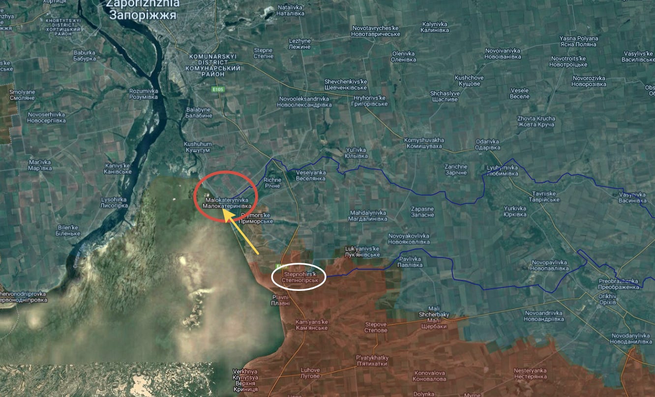 First, the surprising west Zaporozhye sector. Russian forces have continued north of Stepnogorsk (circled in white), which itself is roughly 80-90% captured: