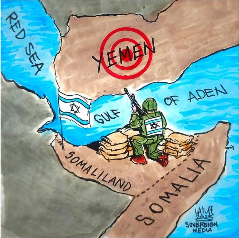 Many times when I hear new information I feel like something is off but I’m not quite sure what it is. For example, when I learned that Israel had been the first nation to recognize Somaliland that felt off. Then I heard that’s where they plan to deport Gazans. Hmm, still seems dubious. Then I saw Carlos Latuff’s political cartoon above clarifying how useful Somaliland could be for attacking Yemen. Ok, now I think I understand.
