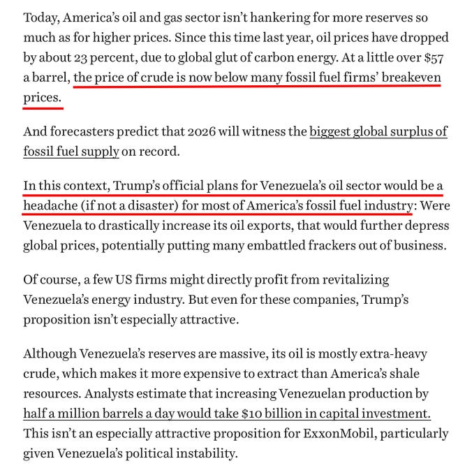 Read that again: “Trump’s official plans for Venezuela’s oil sector would be a headache (if not a disaster) for most of America’s fossil fuel industry.”