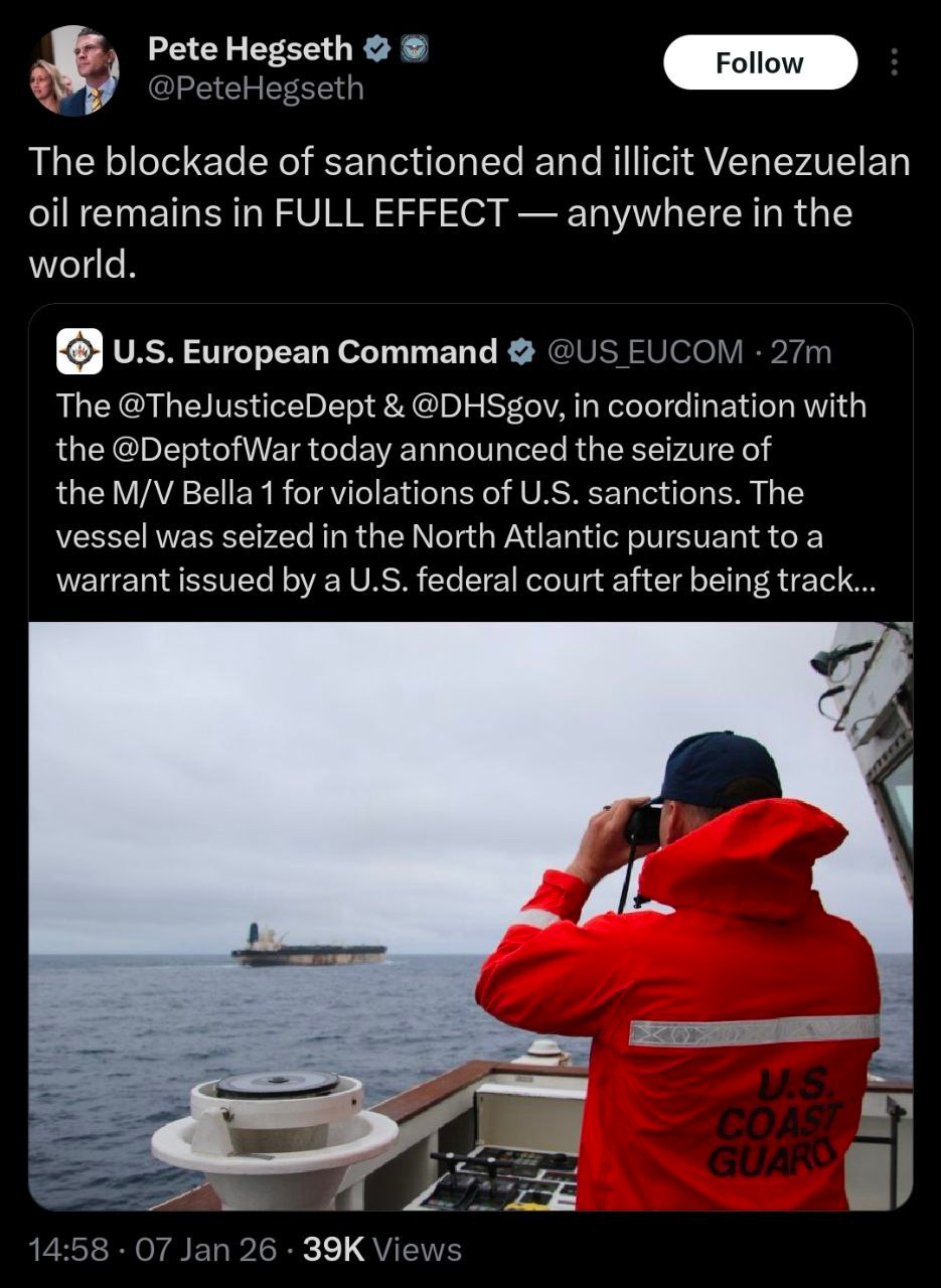 The USA states that it does not consider the tanker “Marinera” to belong to Russia and that it does not belong to any country. The USA continues to claim that it believes it has the right to seize all tankers involved in transporting Venezuelan oil.