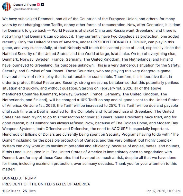New tariff just dropped. Americans set to pay an additional 10% tax on all goods from Germany, the UK, France, the Netherlands, Sweden, Norway, Denmark, and Finland. It starts in two weeks, rising to 25% by June. (Aside: A trade war with one EU member is a trade war with the whole EU).