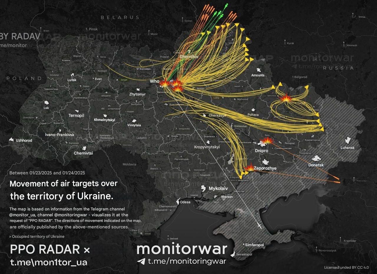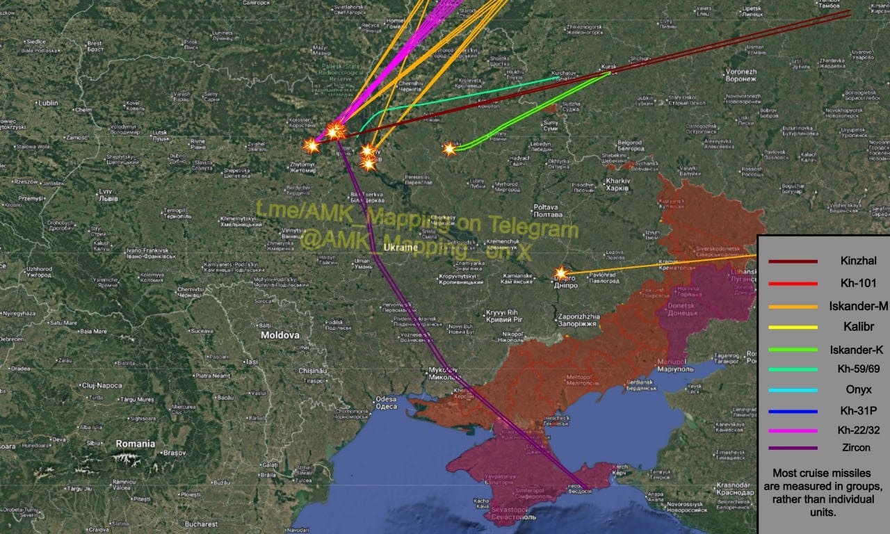Unknown target north of Radomyshl, Zhytomyr Oblast by ~2 Kh-22/32s and ~2 Kinzhals.