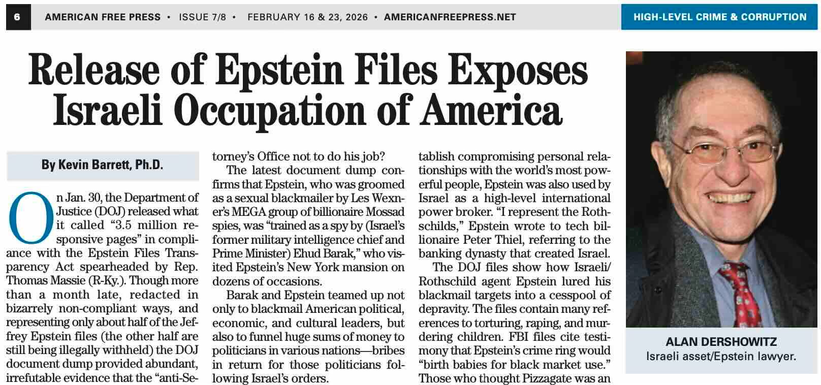 On January 30, the US Department of Justice released what it called “3.5 million responsive pages” in compliance with the Epstein Files Transparency Act spearheaded by Rep. Thomas Massie. Though more than a month late, redacted in bizarrely non-compliant ways, and representing only about half of the Epstein files (the other half are still being illegally withheld) the DOJ document dump provided abundant, irrefutable evidence that the “antisemitic conspiracy theorists” have been right all along: The United States of America is occupied by a Jewish supremacist crime ring based in Israel.