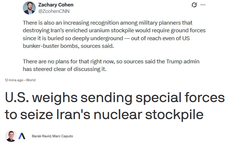 CNN now reports that Iran’s nuclear enrichment stockpile is actually impervious to strikes, and would require boots-on-ground to completely take out—what a shocker: