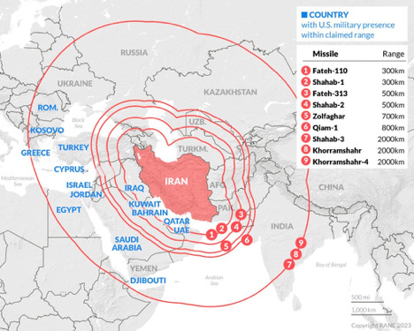 It is being reported that Prince Sultan airbase in Saudi Arabia is being abandoned, and all-American personnel and remaining aircraft are being relocated to a base on the West coast of Saudi Arabia. This base is still well within range of Iranian ballistic missiles as the graph below shows. Pushing the Americans back several hundred kilometers is going to further complicate the already fragile and fraying logistics of this mission. It also places them within the range of the Houthis.