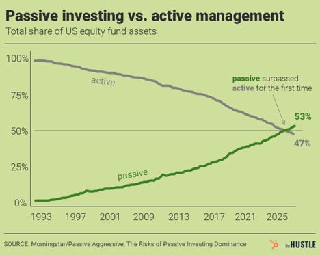 As this Substack has discussed in detail, more than half of American households are right on the edge financially, higher gas and food prices could send them over that edge. Stock ownership is concentrated in the upper 20% of wage earners. These investors are increasingly using passive investing indexes dominated by and managed by State Street, Vanguard, and BlackRock. In addition, ETFs comprise a significant part of the market. Many of these ETF’s are designed to mimic index funds. These products are highly liquid and if sold would require the underlying stocks that make up the index to also be sold. As the chart below shows, passive investing dominates the market.