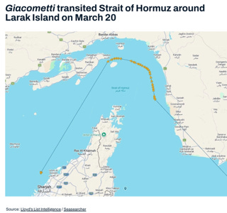 From Arabian Gulf Business Insight in Ships test ‘Iran-approved’ Hormuz corridor : “Ships are passing through the Strait of Hormuz via an “Iran-approved” corridor close to Larak Island off the coast of Iran for verification checks, according to maritime news outlet Lloyd’s List.”