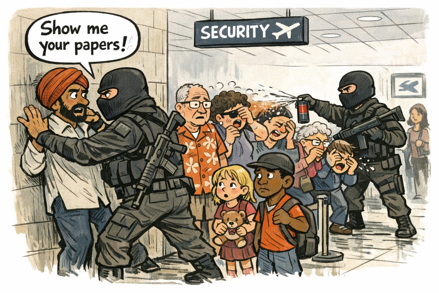 So, picture an armed, masked ICE agent and a long line of impatient passengers of all ethnic groups who are worried about making their flight. Does that sound like the makings of an unfortunate incident? I think I’ll defer any trips involving flying for a while, thank you.